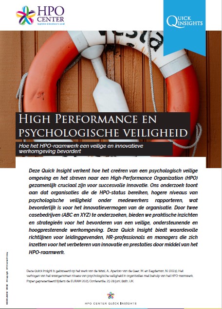 Deze Quick Insight verkent hoe het creëren van een psychologisch veilige omgeving en het streven naar een High-Performance Organization (HPO) gezamenlijk cruciaal zijn voor succesvolle innovatie. Ons onderzoek toont aan dat organisaties die de HPO-status bereiken, hogere niveaus van psychologische veiligheid onder medewerkers rapporteren, wat bevorderlijk is voor het innovatievermogen van de organisatie. Deze Quick Insight biedt waardevolle richtlijnen voor leidinggevenden, HR-professionals en managers die zich inzetten voor het verbeteren van innovatie en prestaties door middel van het HPO-raamwerk.