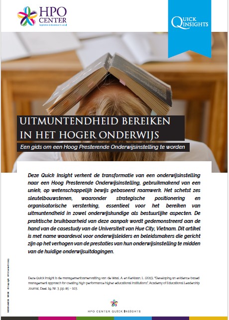 Deze Quick Insight verkent de transformatie van een onderwijsinstelling naar een Hoog Presterende Onderwijsinstelling, gebruikmakend van een uniek, op wetenschappelijk bewijs gebaseerd raamwerk. Het schetst zes sleutelbouwstenen, waaronder strategische positionering en organisatorische versterking, essentieel voor het bereiken van uitmuntendheid in zowel onderwijskundige als bestuurlijke aspecten. De praktische bruikbaarheid van deze aanpak wordt gedemonstreerd aan de hand van de casestudy van de Universiteit van Hue City, Vietnam.