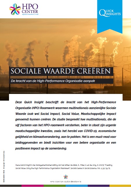 Deze Quick Insight beschrijft de kracht van het High-Performance Organisatie (HPO) Raamwerk waarmee multinationals aanzienlijke Sociale Waarde (ook wel Social Impact, Social Value, Maatschappelijke Impact genoemd) kunnen creëren. De studie bespreekt hoe multinationals, die de vijf factoren van het HPO-raamwerk versterken, beter in staat zijn urgente maatschappelijke kwesties, zoals het herstel van COVID-19, economische gelijkheid en klimaatverandering, aan te pakken.