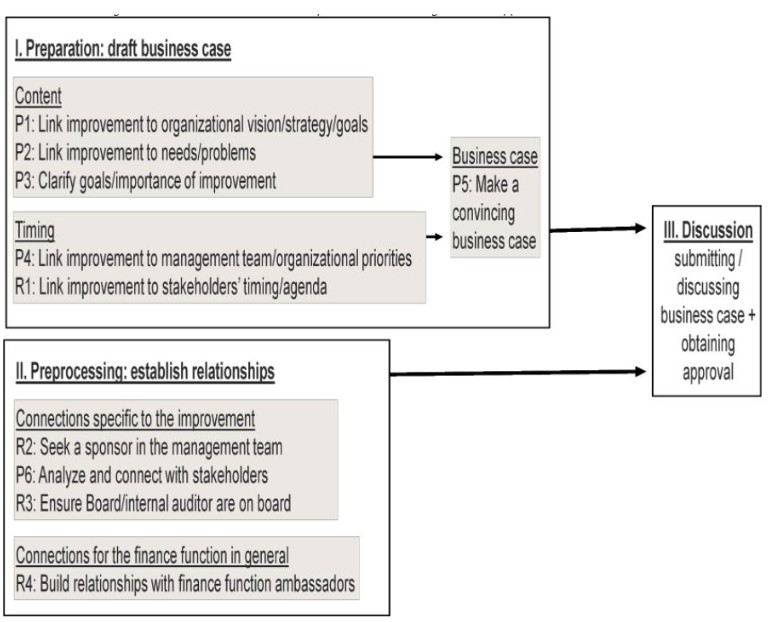 De figuur laat zien dat het succesvol verkrijgen van een verbeterbudget in twee parallelle stappen plaatsvindt. Tijdens stap I wordt een businesscase voor de verbetering en het daarvoor benodigde budget samengesteld. De experts benadrukten hierbij dat het hier niet alleen gaat om het samenstellen van een financiële businesscase maar juist ook om een kwalitatieve businesscase waaruit duidelijk the need for change naar voren komt. Bij stap I wordt onderscheid gemaakt naar de inhoud van de verbetering en de timing dat de verbetering uitgevoerd gaat worden. Met betrekking tot inhoud stellen de experts dat de aangevraagde verbetering van de financiële functie ten goede moet komen aan de organisatie doordat deze het bereiken van de visie/strategie/doelen en prioriteiten van de organisatie en het managementteam ondersteunt (P1 en P4 in figuur 2), of specifieke problemen in de organisatie of specifieke behoeften van de operatie tegemoet komt (P2). In beide gevallen is het essentieel dat het doel van de verbetering en de belangrijkheid daarvan (niet alleen voor de financiële functie maar voor de gehele organisatie) goed helder gemaakt en toegelicht wordt (P3). Relationeel gezien is het verstandig om de verbetering aan te laten sluiten op de agenda van de belangrijkste stakeholders in de organisatie (R1). Door nu zowel de inhoud als de timing van de verbetering goed af te stemmen op wat er gaande is in de organisatie ontstaat een sterke businesscase (P5).